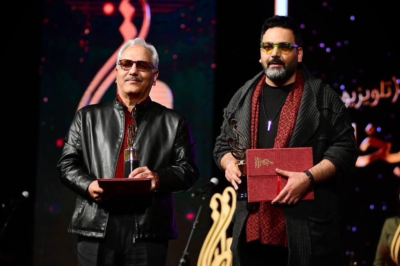 Photo: Mehran Modiri (L) and Ehsan Alikhani hold their awards at the closing ceremony of the 23rd Hafez Awards in Tehran, on November 23, 2024.