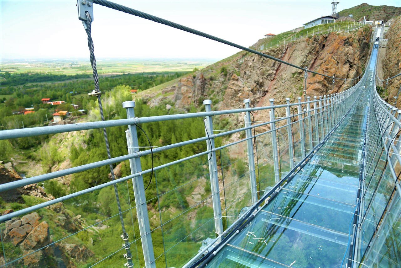 Made of curved sheets of glass, the bridge measures 220 meters in length and connects two hills in the Hir district. The bridge’s all-glass parts and metal cables have been constructed by domestic engineers using high-quality materials and are said to be the first of their kind in the world.