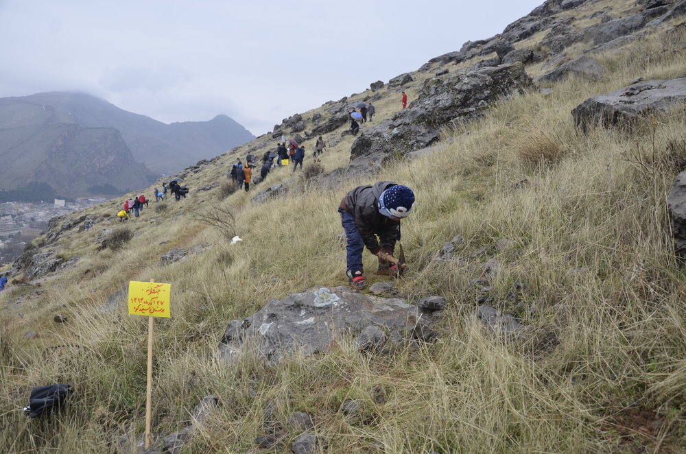 Some of the members of the Talayedaran-e Zagros are seen in background with a little boy in foreground trying to dig a hole for putting sapling inside. The photo was taken at Sefidkooh Park in Lorestan on December 18, 2015. Photographer: Zeinab Telli