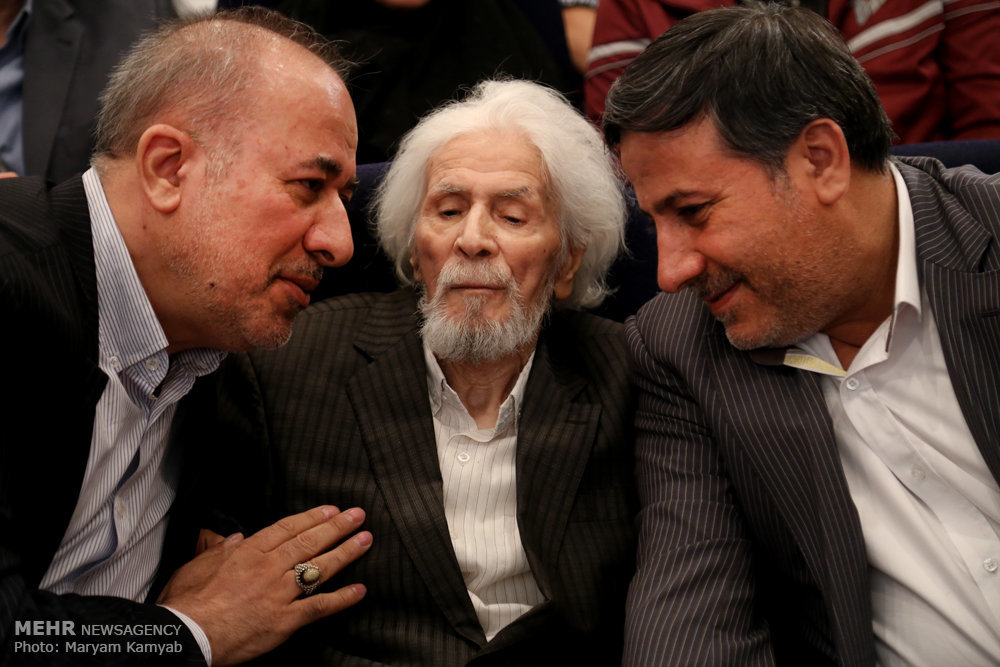 Photo: Hamid Sabzevari (C) attends a ceremony organized by Tehran’s Imam Ali (AS) Religious Arts Museum on May 17, 2016 to honor 91-year-old poet. Art and Cultural Organization of Tehran Municipality Director Mahmud Salahi (L) and an unidentified person are also seen in the photo. (Mehr/Maryam Kamyam)