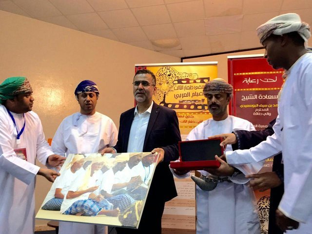 Photo: Cinema Organization of Iran Director Hojjatollah Ayyubi (3rd L) receives presents from some Omani officials during a visit to the Third Dhofar Arab Film Forum on August 19, 2016.