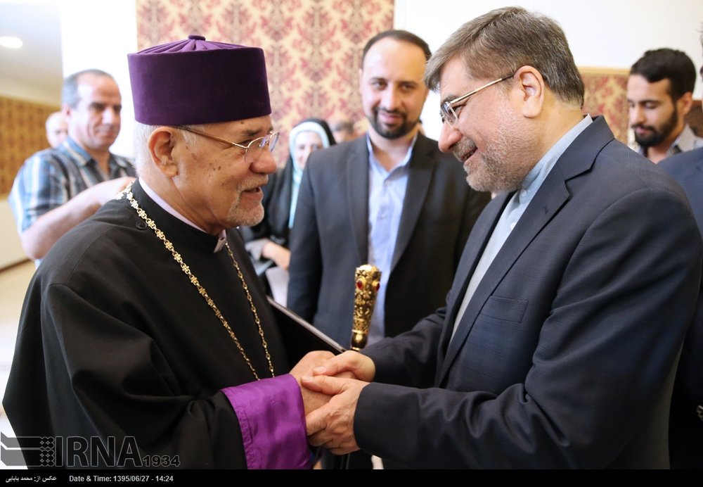 Photo: Minister of Culture and Islamic Guidance Ali Jannati (R) and Archbishop Sebouh Sarkissian, the prelate of the Armenian diocese of Tehran, shake hands during a meeting held by an association of Iranian-Armenian journalists at Tehran’s Parsian Enghelab Hotel on September 17, 2016 to celebrate the 85th anniversary of Alik, a Tehran-based Armenian-language daily. (IRNA/Mohammad Babai)