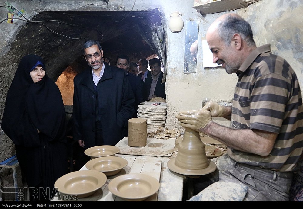 Cultural Heritage, Tourism and Handicraft Organization Director Zahra Ahmadipour (L) pays a visit to a traditional pottery workshop in Laleljin on December 1, 2016.