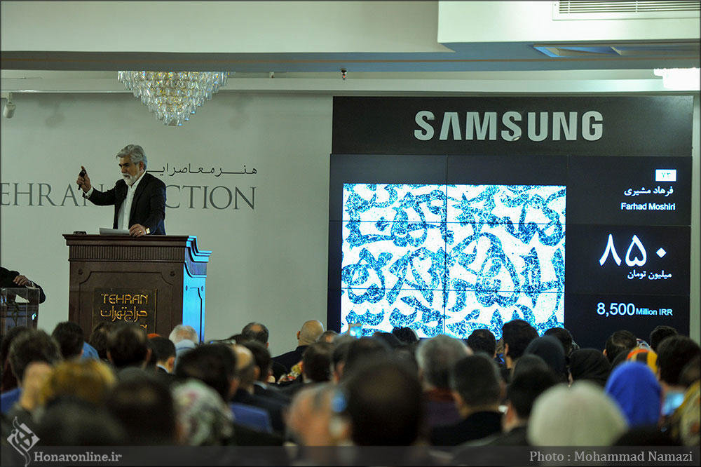 Photo: Auctioneer Hossein Pakdel conducts an auction of “Black Numbers on White”, a calligraphic work by Farhad Moshiri, during the Tehran Auction at the Espinas Palace Hotel in Tehran on December 23, 2016. The artwork was the first top seller, fetching over $213,000. (Honaronline/Mohammad Namazi)