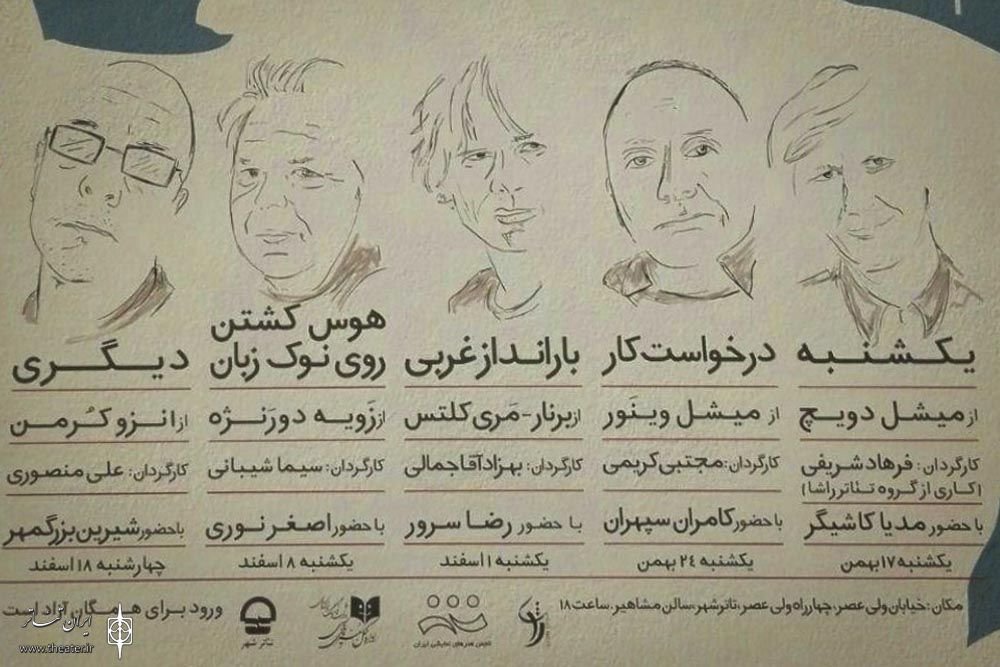 Next, a reading performance will be directed by Mojtaba Karimi on February 12. His troupe will read Michel Vinaver’s “La Demande d’emploi” (“The Application for Employment”).