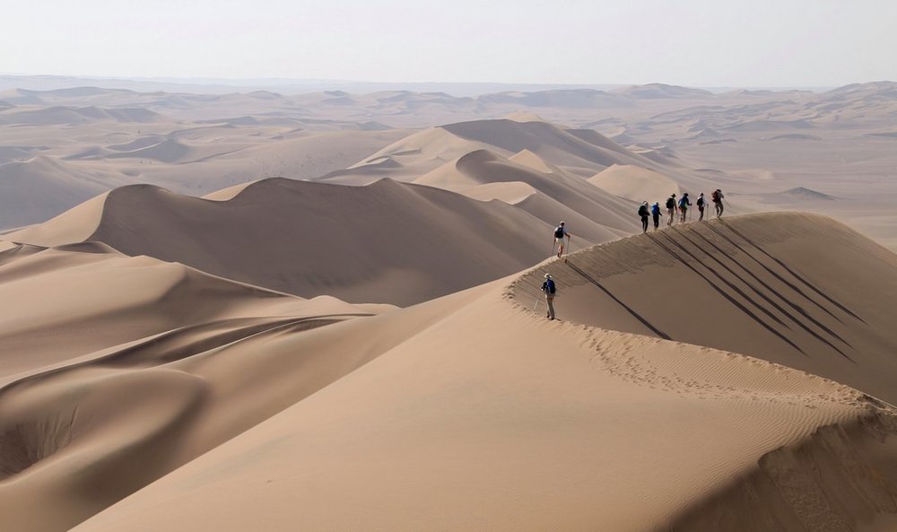 Traversing dunes, rock corridors, kaluts, meteorite fields and rocky terrain, such expeditions is essentially carried out by teams on foot, with support and water supply from 4WD vehicles.