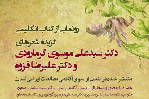 TEHRAN – A collection of works by Iranian poets Seyyed Ali Musavi Garmarudi and Alireza Qazveh has recently been published in English by the London Academy of Iranian Studies, the Art Bureau in Tehran announced on Friday.