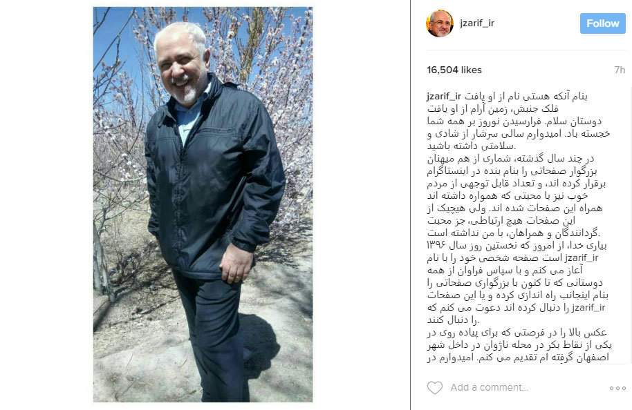 “With God’s help, from today on, which is the first day of the year 1396 (March 21), I will start my personal page named @jzarif_ir,” Zarif wrote on his Instagram, posting a casual photo.