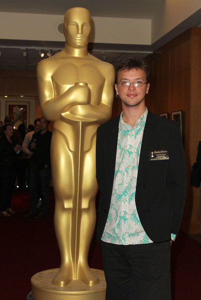 Photo: French director Bastien Dubois poses beside an Oscar statue.