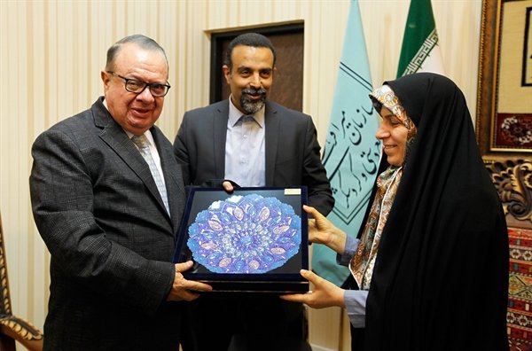 PHOTO: CHTHO Director Zahra Ahmadipour presents a gift to Juan Alfredo Pinto Saavedra, Colombia’s accredited ambassador to Tehran, on May 2, 2017.