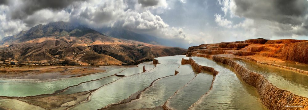 A scenic destination for eco-travelers in northern Iran, Badab-e Surt bargains its visitors with a striking panorama of rust-colored travertine terraces adjacent to the Alborz mountain range.