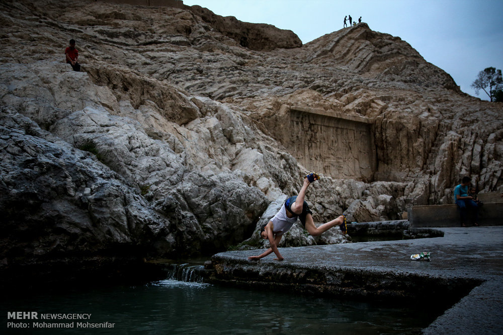 A boy dives into a pool in Cheshmeh-Ali, literally meaning Spring of Ali, a historical and recreational spot located in the south of Tehran and north of Rey, on July 14, 2017. A 19th-century rock-carved bas-relief commissioned by the Qajar king Fath Ali shah (r. 1797 – 1834) is seen in the background as well.