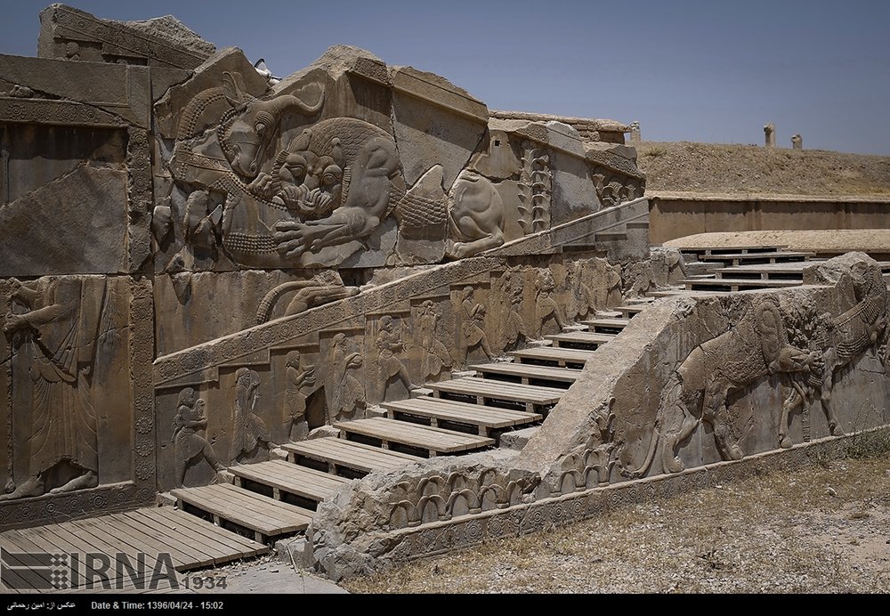 The topmost bas-relief depicting a lion attacking a bull is a recurrent theme among Persepolis sculptures. Persepolis was the ceremonial capital of Achaemenid Empire (550 –330 BC).