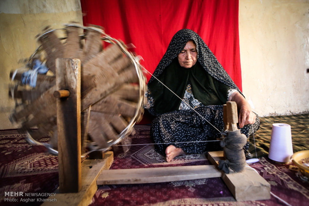 A woman uses an indigenous spinning wheel to make threads from natural fiber at a small-scale workshop in Rueen, a village in northeast Iran, August 5, 2107.