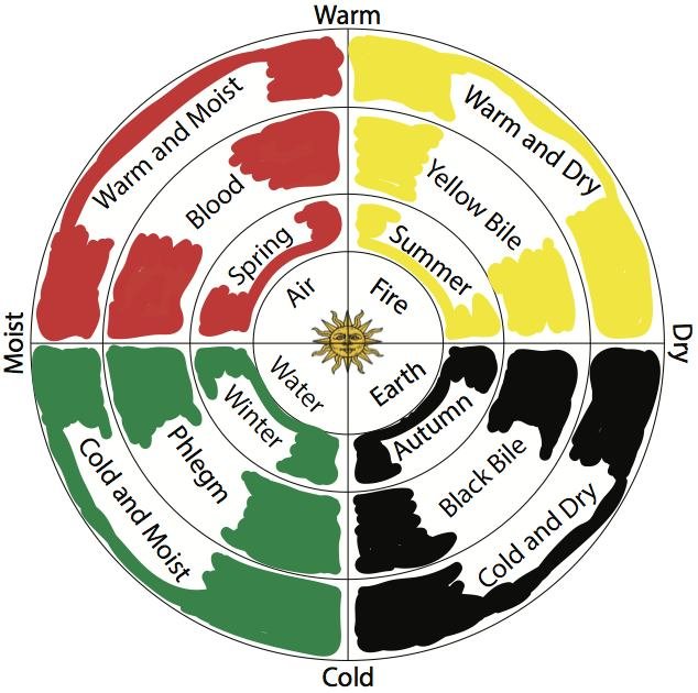 In the Iranian-Islamic traditional medicine the excess or lack of warmness and humidity define four essential temperaments of “Warm and Wet (sanguine or Damawiy)”, “Warm and Dry (choleric or Safrawiy)”, “Cold and Dry (melancholic or Saudawiy)” and “Cold and Wet (phlegmatic or Balghamiy)” respectively. The terms in the parentheses refer to four groups of material in the body (called “humors” or 'Akhlat') including blood which is hot and moist, phlegm which is cold and moist, bilious or yellow bile which is hot and dry and atrabilious or black bile which is cold and dry. Words written in italic show original Persian terms in the ancient literature.