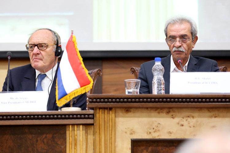 PHOTO: Yve-Thibault de-Silguy, the vice president of MEDEF (L), and Gholam-Hossein Shafeie, the chairman of ICCIMA