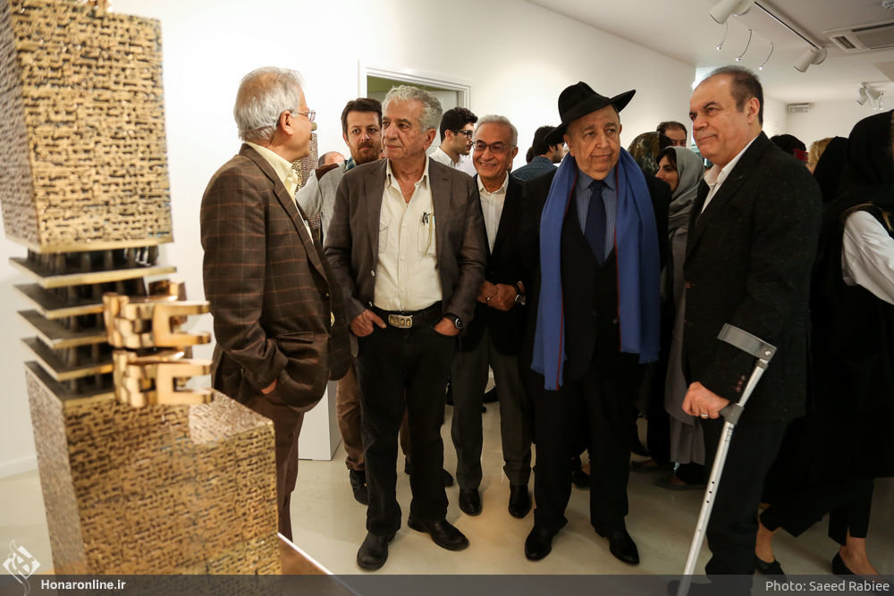 Photo: Sculptor Parviz Tanavoli (3rd L) attends the opening ceremony of his exhibit at Tehran’s Boom Gallery on November 3, 2017.  (Honaronline/Saeid Rabiei)