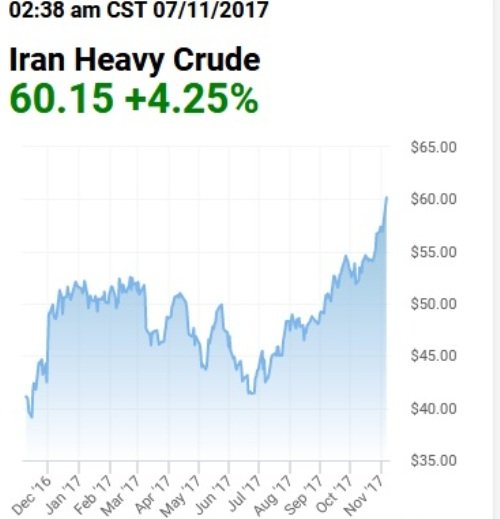 The price rose by $2.45 per barrel or 4.2 percent to push Iranian crude price once again into the $60 range after two years.
