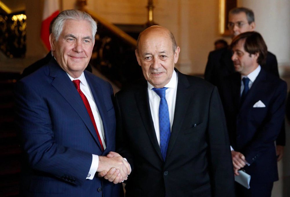 A day after similar talks in London with British officials, U.S. Secretary of State Rex Tillerson met with French Foreign Minister Jean-Yves Le Drian to make the case in what were expected to be tense discussions.