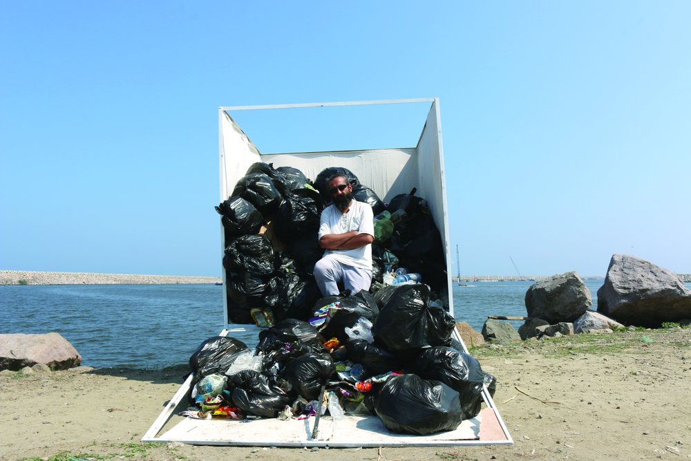 “Out of sight but alongside” was performed in January 2016. He tied some trash, mostly empty bottles, to himself using ropes and dragged them while walking on the streets of the capital intending to warn people how the trash we produce does not vanish off the face of the earth but merely hides in the landfill and finally drags down our poor and helpless environment.