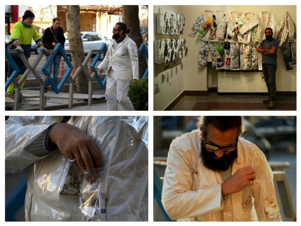 In another performance he gave in the same year called “my city is my clothes” while walking in the streets he gradually filled his white clothes, covered with a plastic layer, with cigarette butts thrown away on the street to convey a message to the people: “What I’m wearing is a part of my city. My city is my clothes.”