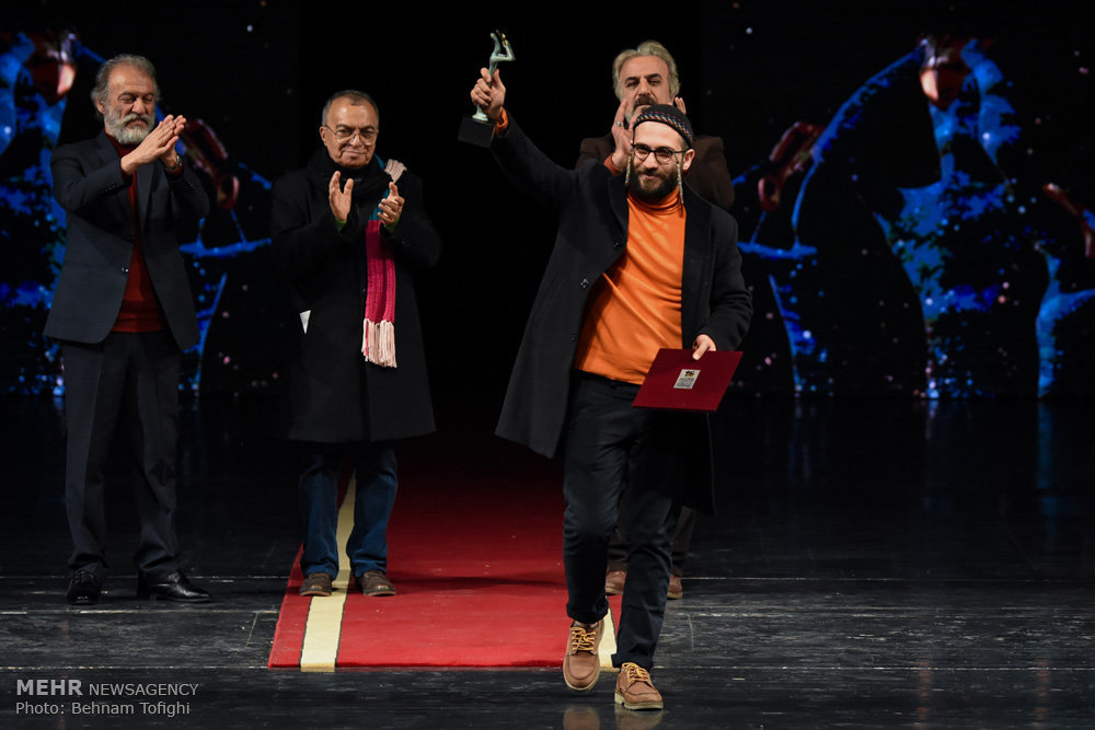 Photo: Ashkan Kheilnejad holds the award for best director for his play “The History Boys” during the 36th Fajr International Theater Festival at Tehran’s Vahdat Hall, January 29, 2018. (Mehr/Behnam Tofiqi)