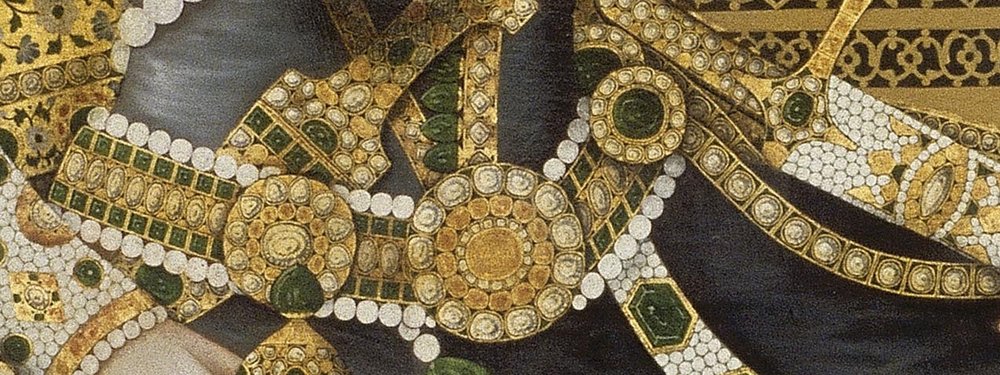 PHOTO: Detail shows a depiction of ceremonial daggers being carried by a Qajar sovereign.