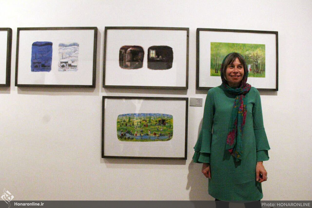 Photo: Swedish illustrator Marit Törnqvist poses beside her works in an exhibition at the Iranian Artists Forum in Tehran on April 13, 2018. (Honaronline/Zeinab Shoaei)