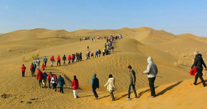 PHOTO: Holidaymakers hike across a desert route in Sistan-Baluchestan province, southeast Iran.