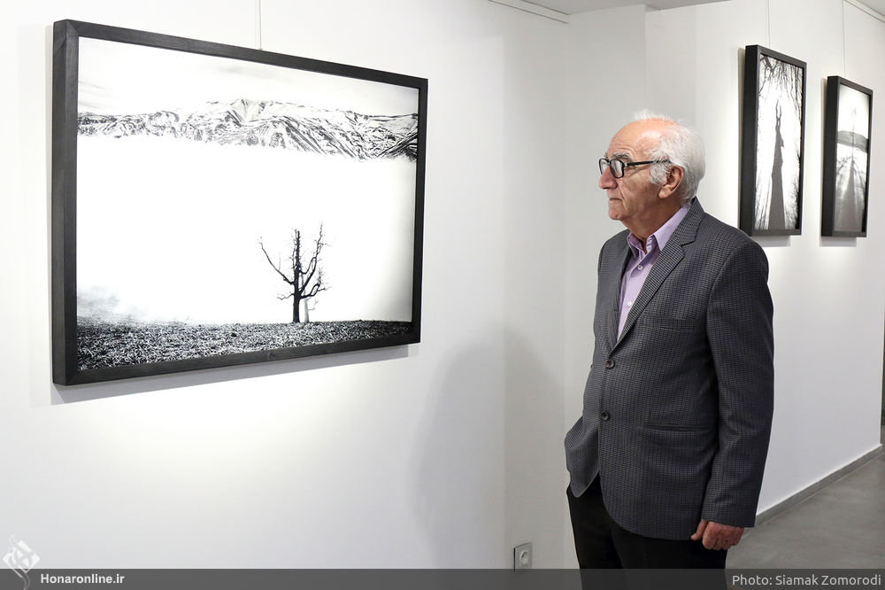 Photo: Actor Reza Banafshehkhah looks at a photo in the exhibit “The Passion of Trees” by Ali Shokri at Mojdeh Gallery on May 5, 2018. (Honaronline/Siamak Zomorrodi)
