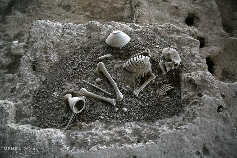 Photo depicts prehistoric human remains and potteries being on display at a local museum in Gohar-Tappeh archaeological site, May 27, 2018.