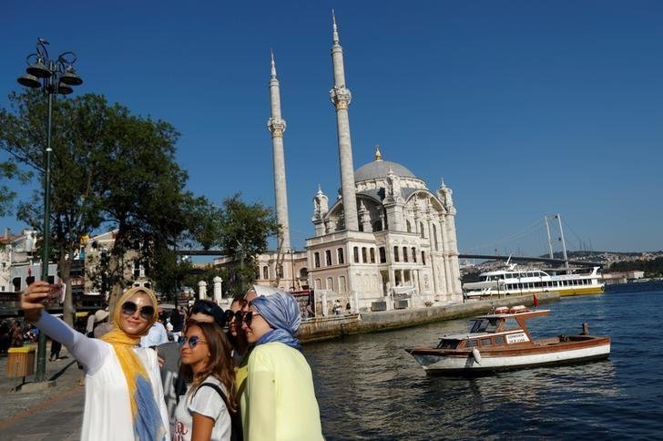 PHOTO: People pose for a selfie with the Ottoman-era Ortakoy Mecidiye mosque in the background in Istanbul, Turkey, August 28, 2017.(REUTERS/Murad Sezer)
