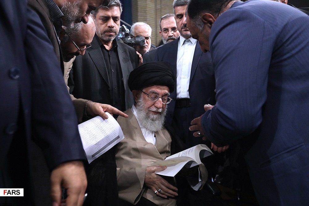 Photo: Leader of the Islamic Revolution Ayatollah Seyyed Ali Khamenei takes a glance at a book he received during a meeting with literati and filmmakers on September 16, 2019. (Khamenei.ir)