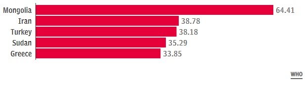 According to the report, Mongolia had the highest rate of antibiotic use with 64 DDD, per 1,000 inhabitants per day.
