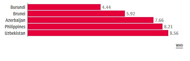 The country with the lowest rate of antibiotic use was Burundi in east Africa whose consumption amounted to only four DDD per 1,000 inhabitants per day. Azerbaijan was also among the countries with the lowest rate of antibiotic use at around seven DDD.