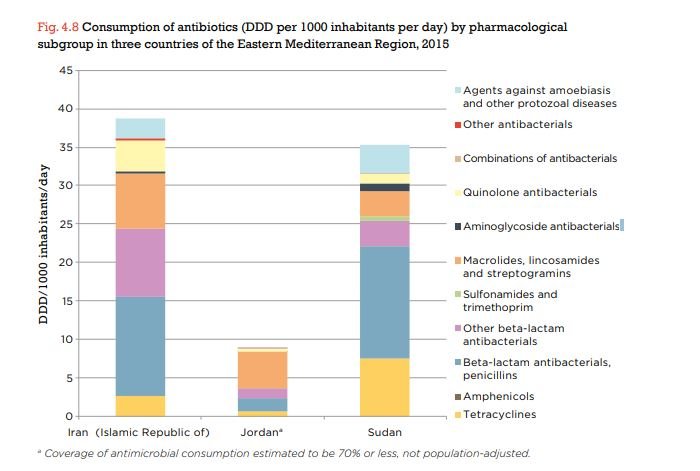 With 38 DDD per 1000 inhabitants per day, Iran’s consumption of antibiotics exceeded other monitored Mediterranean countries, as the total consumption in Jordan and Sudan was 8 DDD and 35 DDD, respectively.