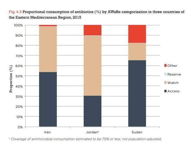 In Iran, around 50 percent of the antibiotics were in the Access group and 45 percent were in the watch group; in Sudan, access group antibiotics consumption was around 60 percent, but watch group antibiotics only amounted to 17 percent of the usage.