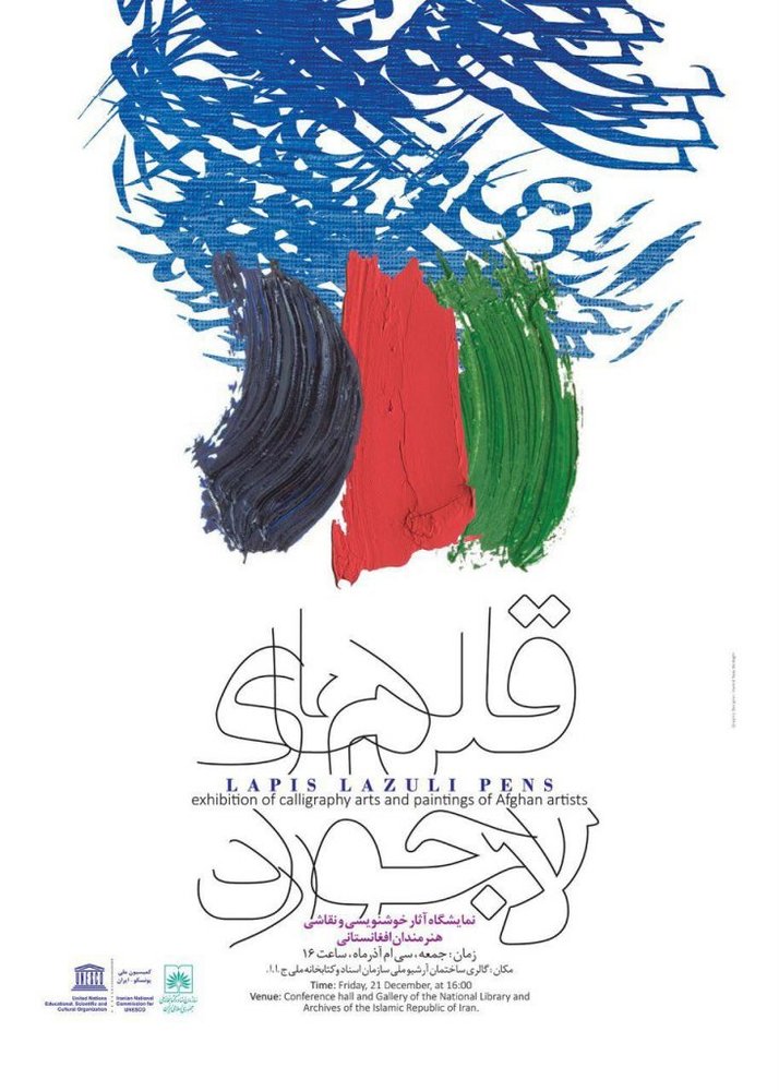 Photo: A poster for the Afghan artists’ exhibition “Lapis Lazuli Pens” at the National Library and Archives of Iran.