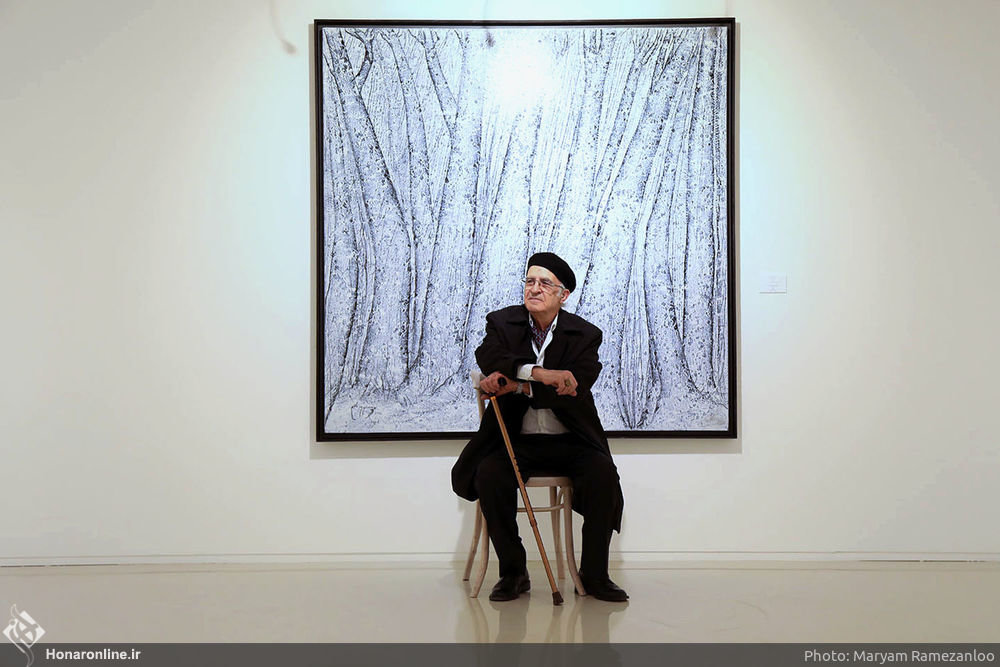 Photo: Veteran artist Manuchehr Niazi poses during an exhibition of his artworks at Tehran’s Boom Gallery on January 4, 2019. (Honaronline/Maryam Ramezanlu)