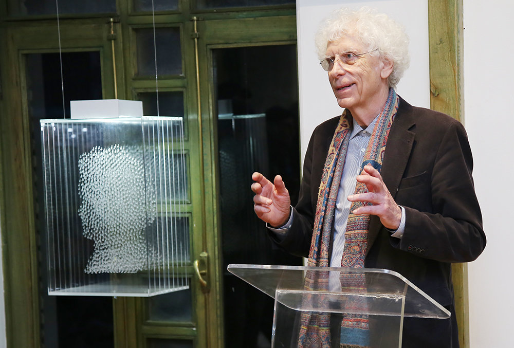 Knut Reinhardt speaks at Tehran’s Art Center on February 22, 2019 during the opening ceremony of an exhibition displaying a collection he has created along with his wife Ingrid.