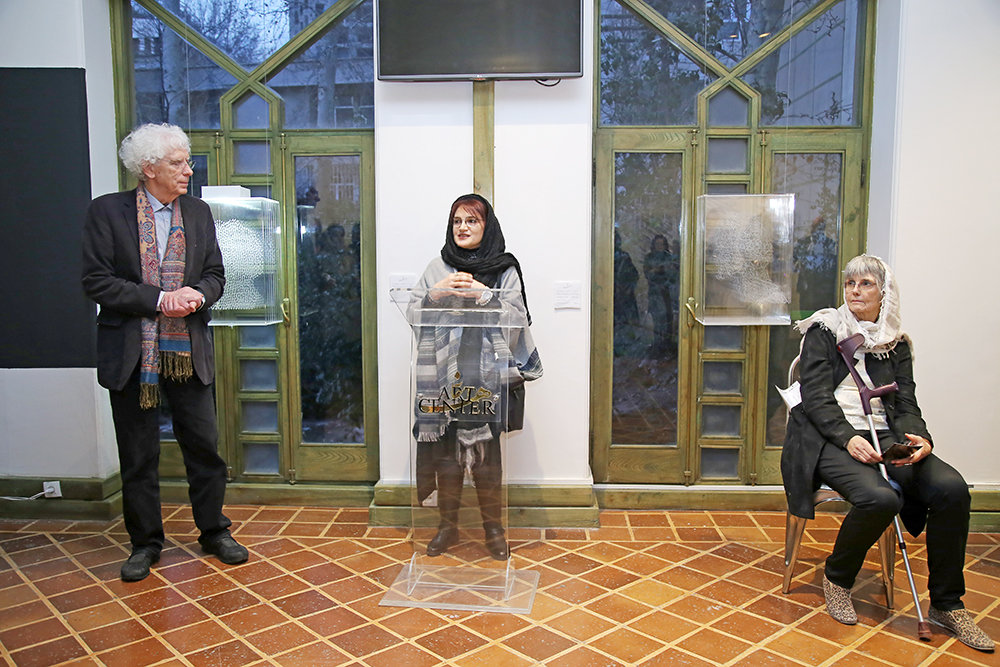 German artist couple Knut (L) and Ingrid (R) attend the opening ceremony of their exhibition at Tehran’s Art Center on February 22, 2019 as an unidentified person is seen speaking in the photo.