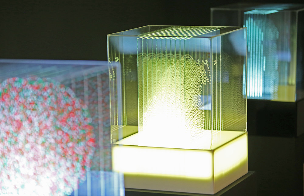 “The Beethoven bust here on display has been implemented by several Iranian craftsmen. The holes look like music notes on layers of plexiglass. We gave the craftsmen the program and they produced the work. They had laser machines that we don’t have, so they used our program, perforated the layers of plexiglass and made the bust,” she said with a surprise in her voice.