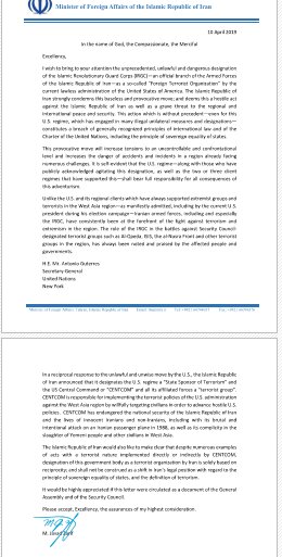 I wish to bring to your attention the unprecedented, unlawful and dangerous designation of the Islamic Revolutionary Guard Corps official branch of the Armed Forces of the Islamic Republic of Iran—as a so-called "Foreign Terrorist Organization" by the current lawless administration of the United States of America. The Islamic Republic of Iran strongly condemns this baseless and provocative move; and deems this a hostile act against the Islamic Republic of Iran as well as a grave threat to the regional and international peace and security. This action which is without precedent—even for this U.S. regime, which has engaged in many illegal unilateral measures and designations— constitutes a breach of generally recognized principles of international law and of the Charter of the United Nations, including the principle of sovereign equality of states.