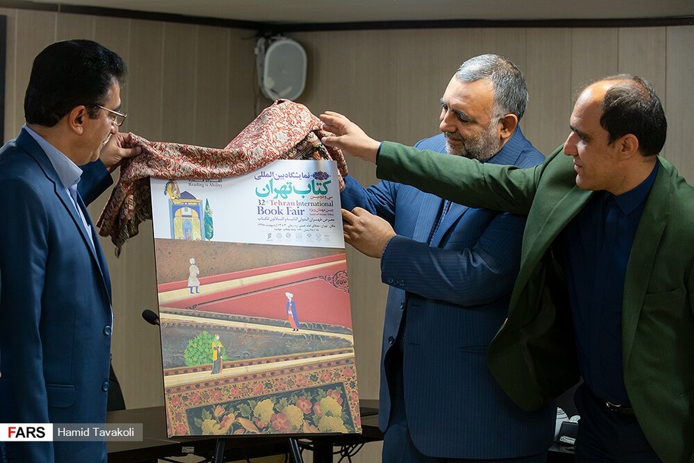 Photo: Organizers unveil a poster for the 32nd Tehran International Book Fair on April 17, 2019. (Fars/Hamid Tavakkoli)