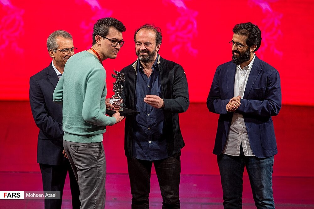 Photo: Russian cinematographer Ayrat Yamilov (2nd L) receives the award for best film on behalf of “A Russian Youth” director Alexander Zolotukhin during the 37th Fajr International Film Festival at Tehran’s Vahdat Hall on April 25, 2019. (Fars/Mohsen Atai)