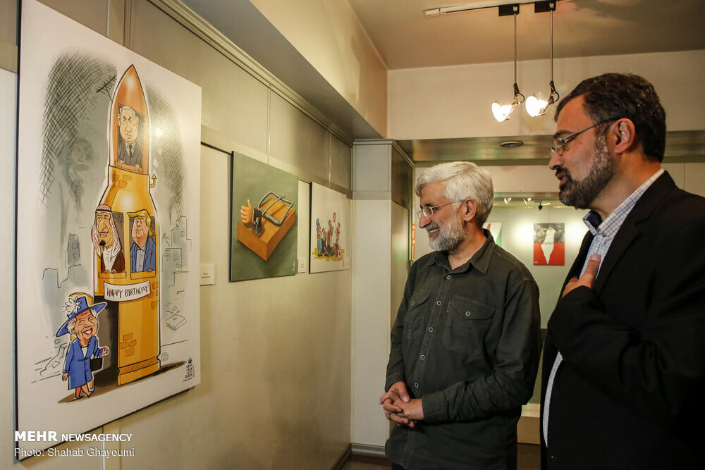 Photo: Former secretary of Iran’s Supreme National Security Council Saeid Jalili (L) and Art Bureau’s Visual Arts Center director Masud Shojaei-Tabatabai visit the cartoon exhibition “Keep Calm, I Am the Queen” at Abolfazl Aali Gallery in Tehran on June 11, 2019. (Mehr/Shahab Qayyumi)