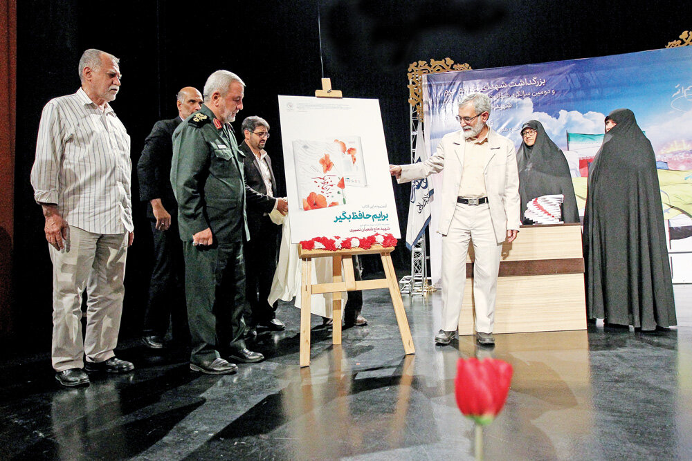 Iranian politician Gholamhossein Elham (C) unveils a poster for “Consult the Divan of Hafiz”, the memoir of IRGC Qods Force commander Qassem Soleimani’s advisor Shaban Nasiri, during a meeting at the Art Bureau in Tehran on June 17, 2019.