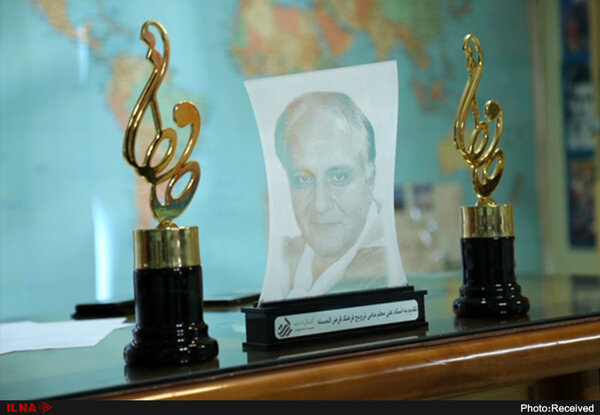 Photo: Picture of Ali Moallem, the founder of the Hafez Awards, who is seen between the Hafez trophies.