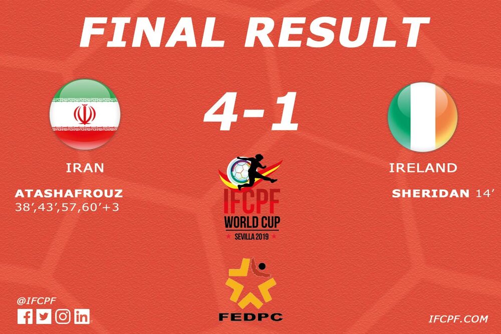 TEHRAN – Iran emerged victorious over Republic of Ireland in the 2019 International Federation of Cerebral Palsy Football (IFCPF) World Cup in Sevilla, Spain on Wednesday.