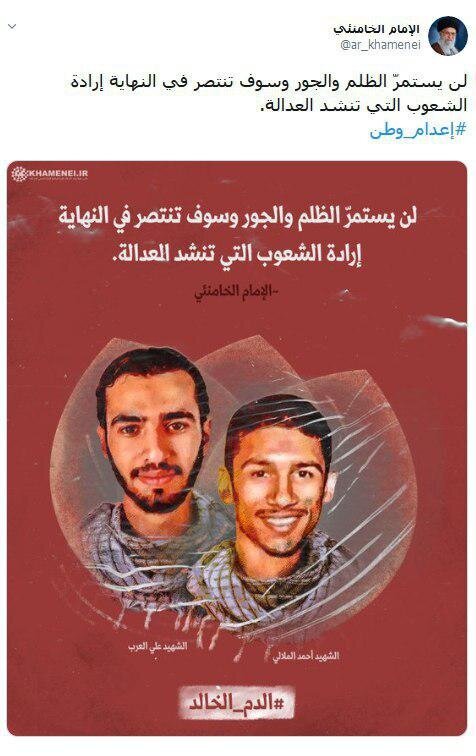 TEHRAN – The Arabic Twitter account of the Office for Preserving and Promoting the Works of Leader of the Islamic Revolution Ayatollah Ali Khamenei has posted a tweet to react to the recent execution of two young Bahraini political activists by the al-Khalifa regime.
